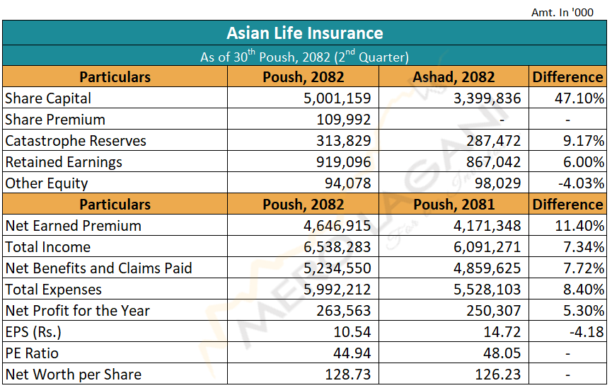 एशियन लाइफ इन्स्योरेन्सको नाफा सामान्य बढ्यो, प्रतिशेयर आम्दानी भने घट्यो