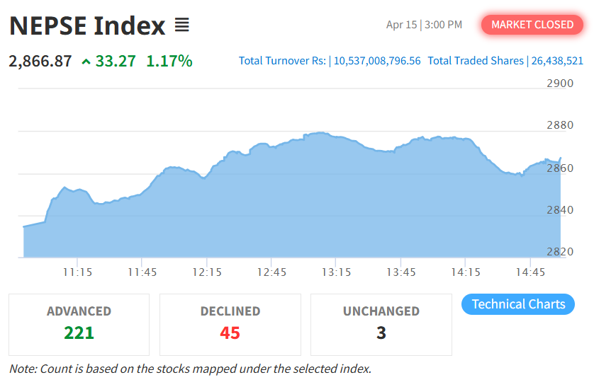 बुधबार नेप्से परिसूचक ३३.२७ अंक बढेर २८६६.८७ विन्दुमा पुगेको छ। त्यस्तै, यस दिन सेन्सेटिभ इण्डेक्स ५.२२ अंक बढेको छ भने फ्लोट इण्डेक्स २.१४ अंक र सेन्सेटिभ फ्लोट इण्डेक्स १.६५ अंक बढेको छ।