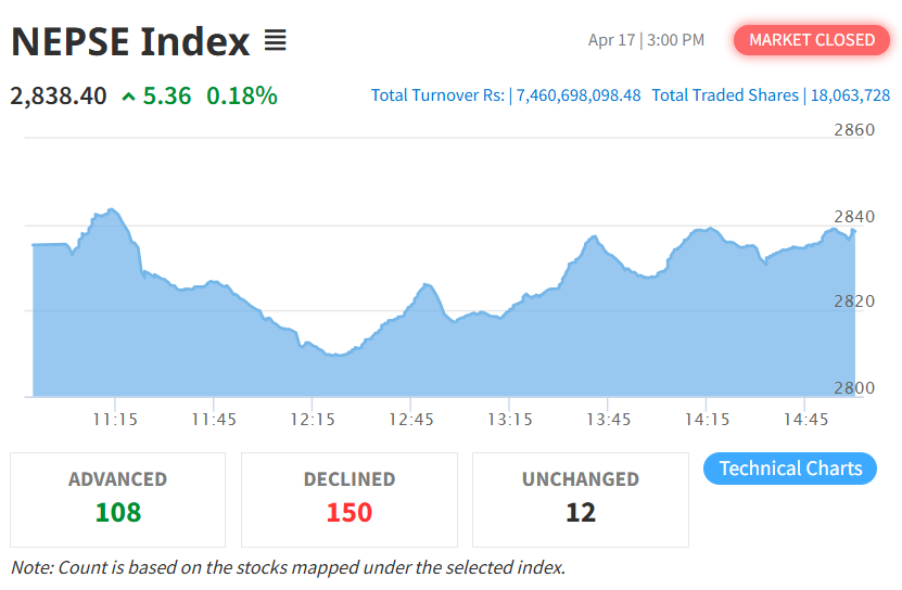 शुक्रबार नेप्से परिसूचक ५.३६ अंक बढेर २८३८.४० विन्दुमा पुगेको छ। यस दिन सेन्सेटिभ इण्डेक्स ०.५८ अंक घटेको छ भने फ्लोट इण्डेक्स ०.०३ अंक र सेन्सेटिभ फ्लोट इण्डेक्स ०.२९ अंक घटेको छ।